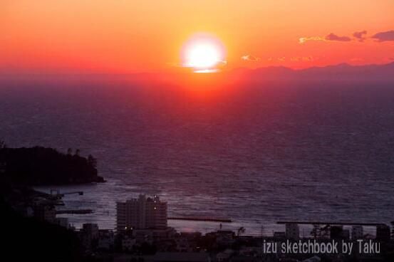 土肥・ヘリポート下から町の彼方に沈む夕陽を撮影。