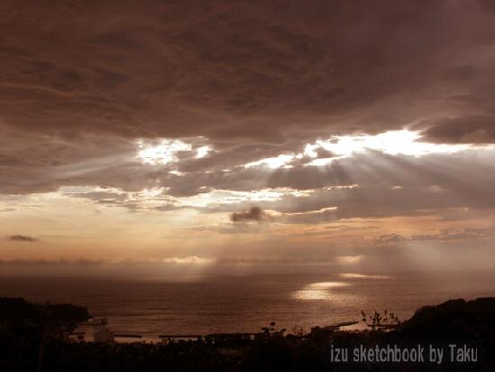 雲の切れ目から光の筋が海面を照らす荘厳な瞬間。