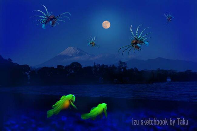 ミジンベニハゼとミノカサゴを配置し、月を合成。 地面と空を加工して各パーツをなじませ完成。