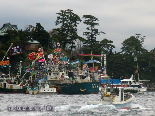 漁船は大漁旗を掲げ、目いっぱいドレスアップして次々と湾内に入り、ぐるぐる周回を始めます。